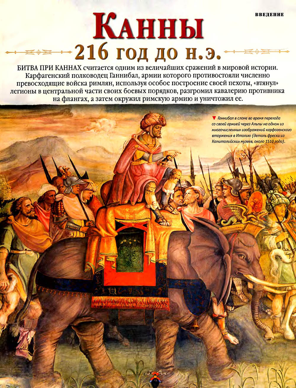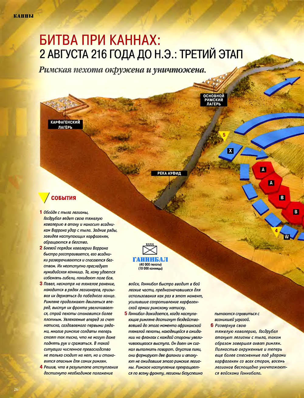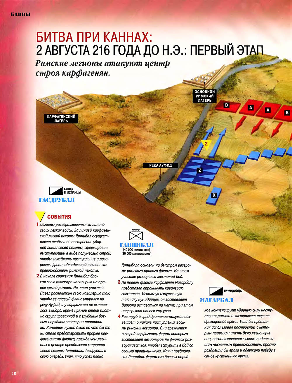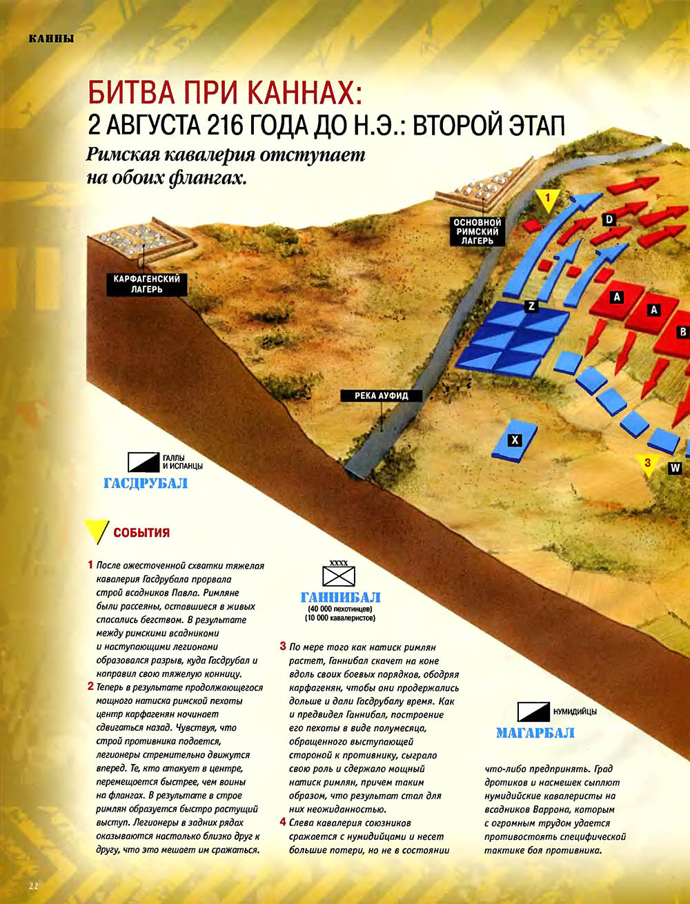 Битва при Каннах считается одним из величайших сражений в мировой истории. Карфагенский полководец Ганнибал, армии которого противостояли численно провосходящие войска римлян, используя особое построение своей пехоты, "втянул" легионы в центральной части своих боевых порядков, разгромил кавалерию противника на флангах, а затем окружил римскую армию и уничтожил ее.