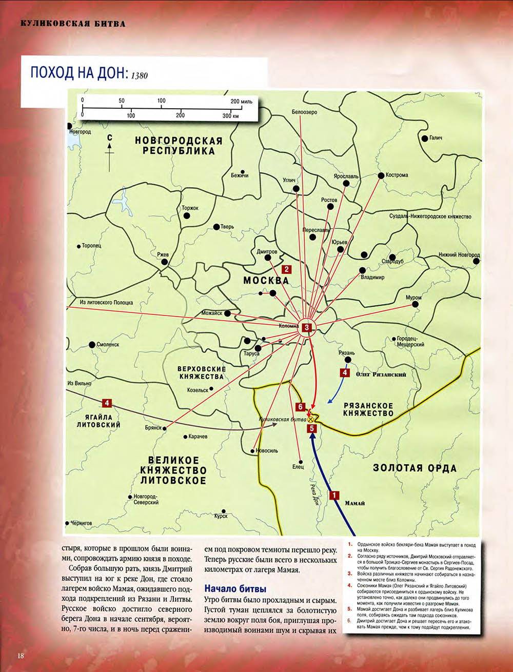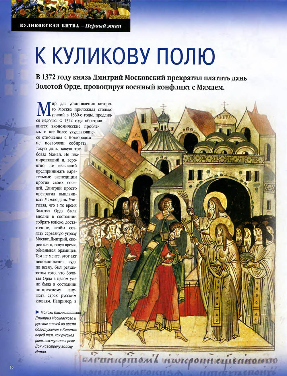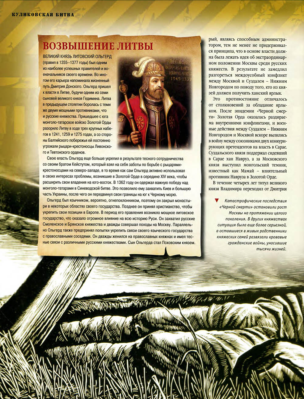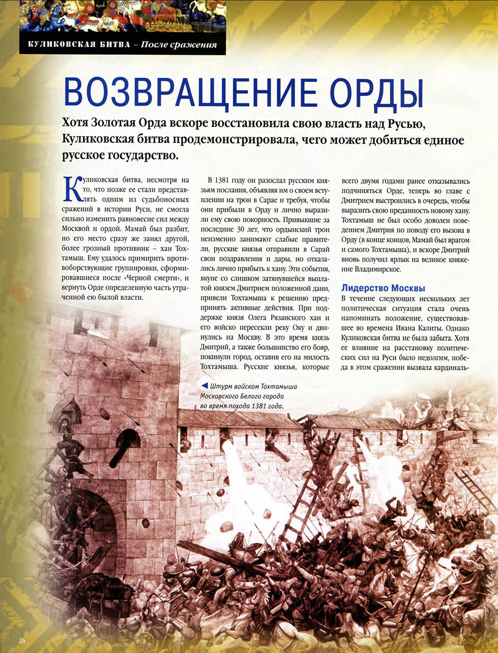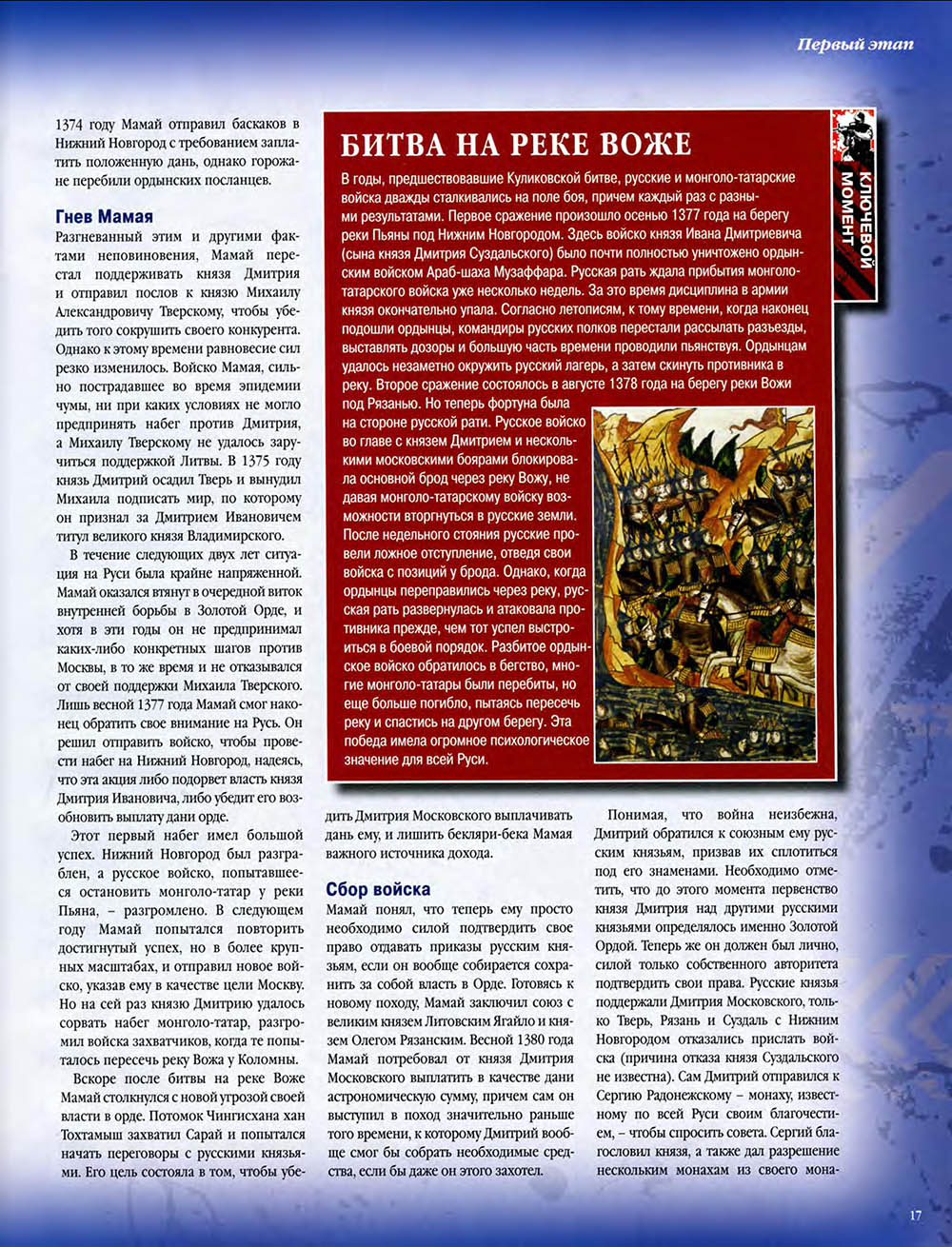 В Куликовской битве русские князья впервые одержали серьезную победу над Золотой Ордой. Это необычно кровавое и ожесточенное сражение закрепило за московским князем Дмитрием Донским первенство на Руси и в дальнейшем способствовало объединению Русского государства.
