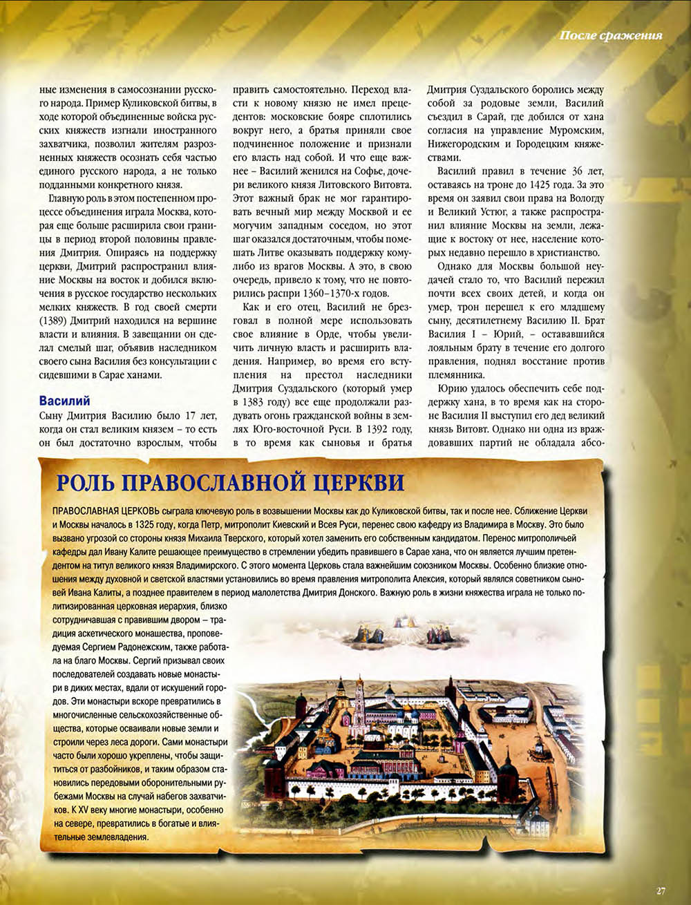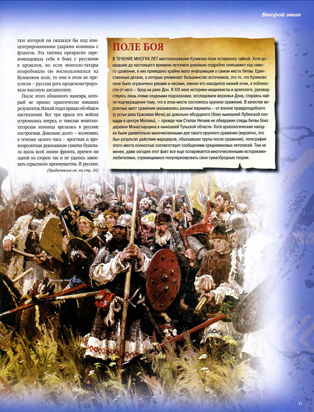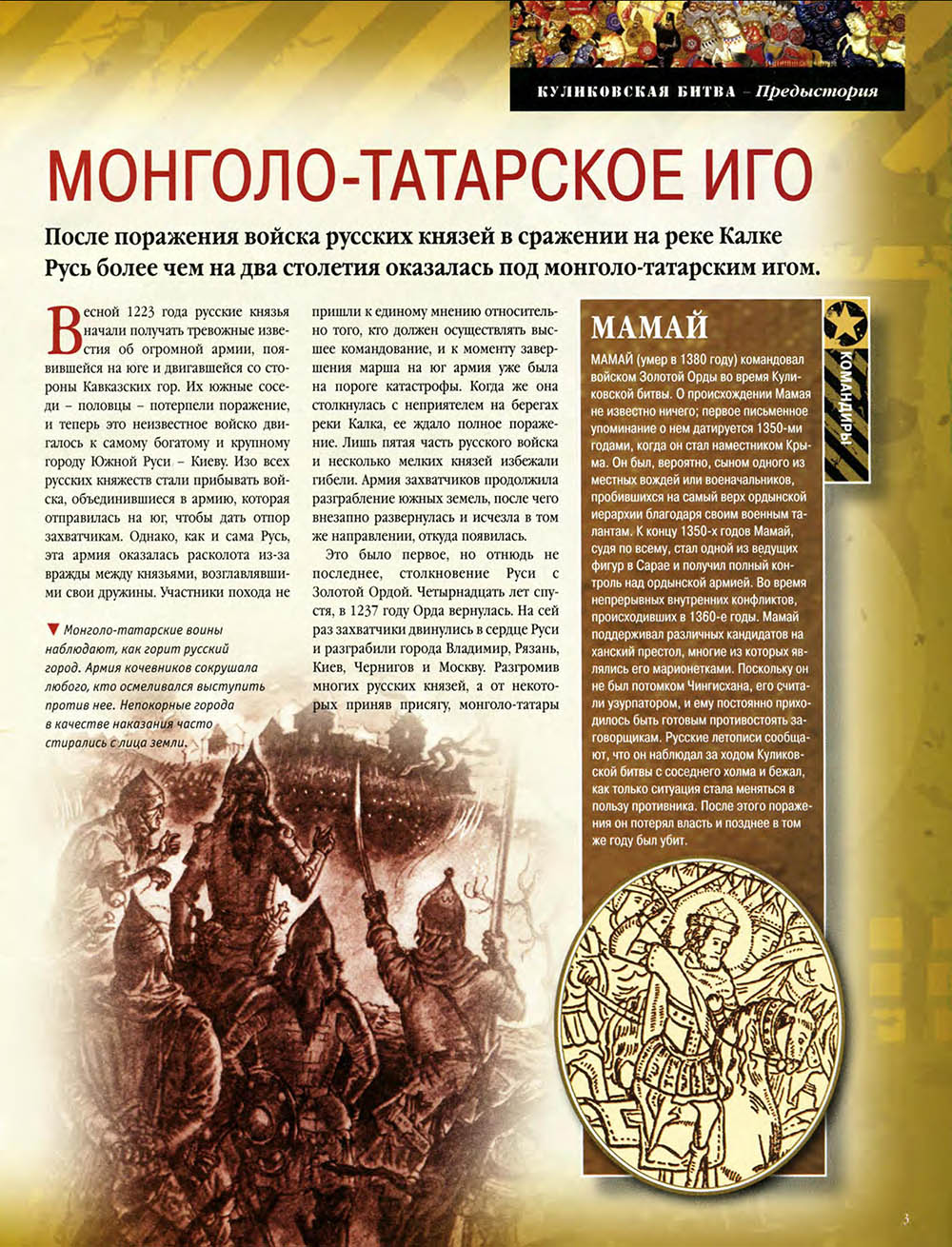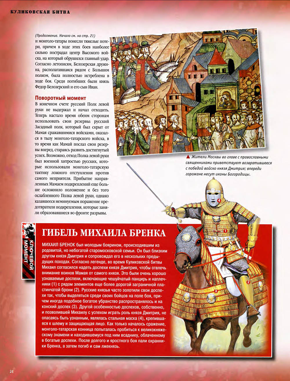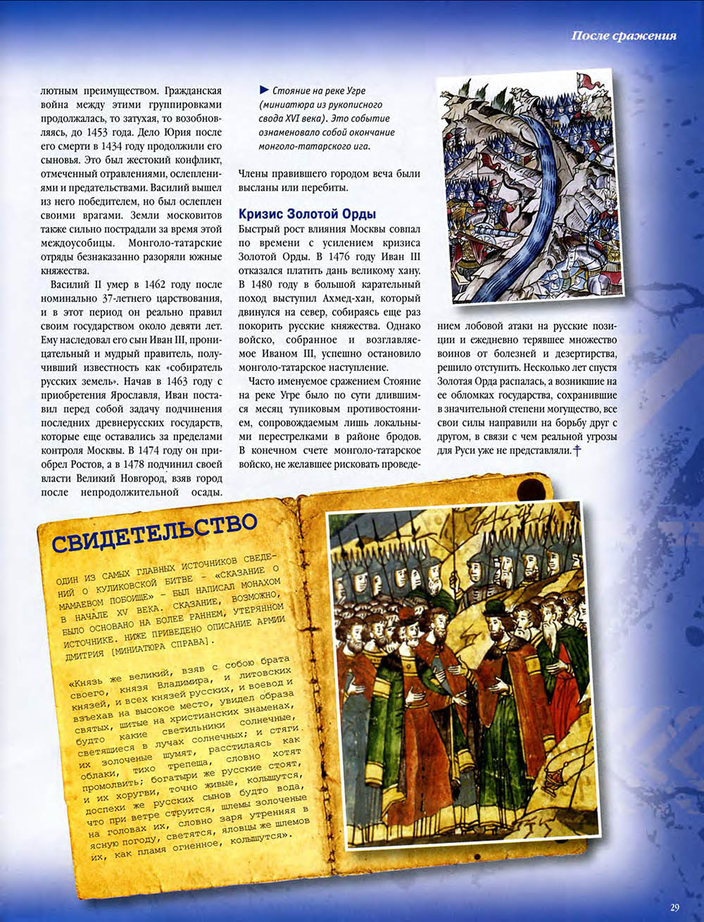 В Куликовской битве русские князья впервые одержали серьезную победу над Золотой Ордой. Это необычно кровавое и ожесточенное сражение закрепило за московским князем Дмитрием Донским первенство на Руси и в дальнейшем способствовало объединению Русского государства.
