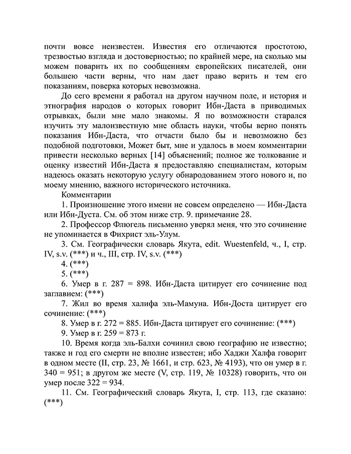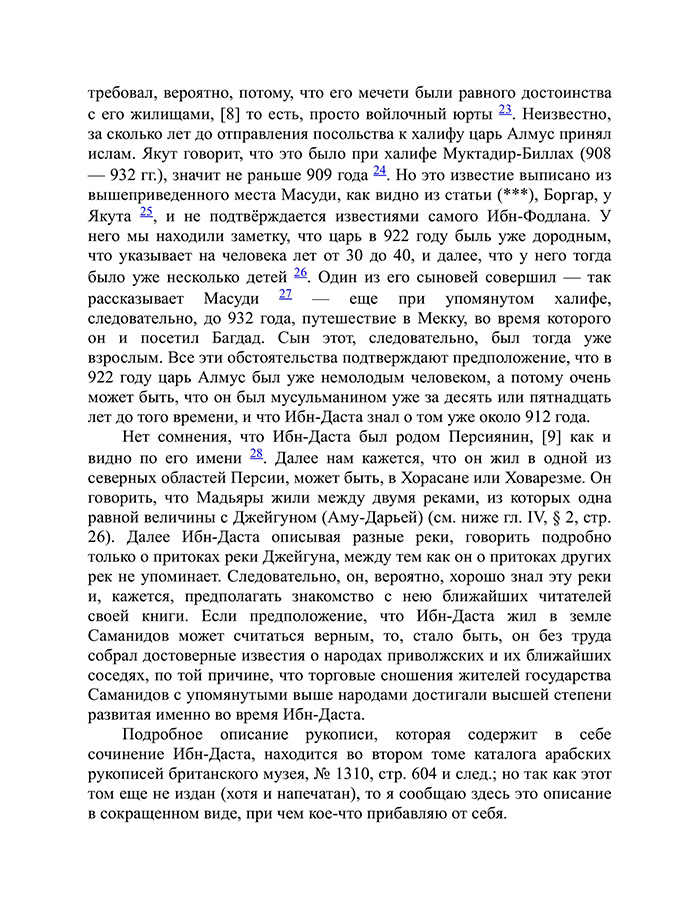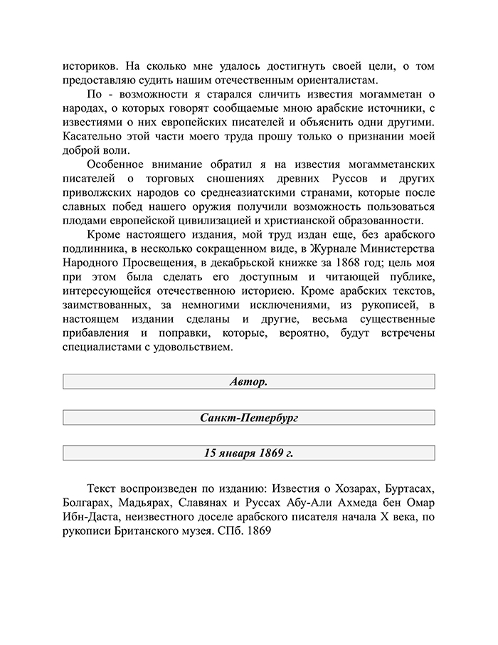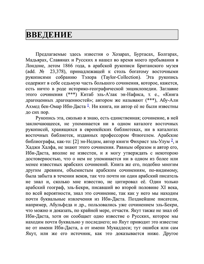 Перевод Даниила Хвольсона рукописи из Британского музея за авторством арабского писателя начала X века Абу-Али-Ахмеда-бен Омара-Ибн-Даста "Известия о Хозарах, Буртасах, Болгарах, Мадьярах, Славянах и Руссах".